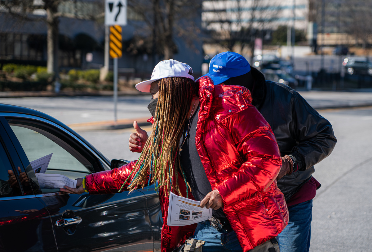 Protesters hand out flyers pushing for benefits for hair and makeup workers at The Atlanta Opera.